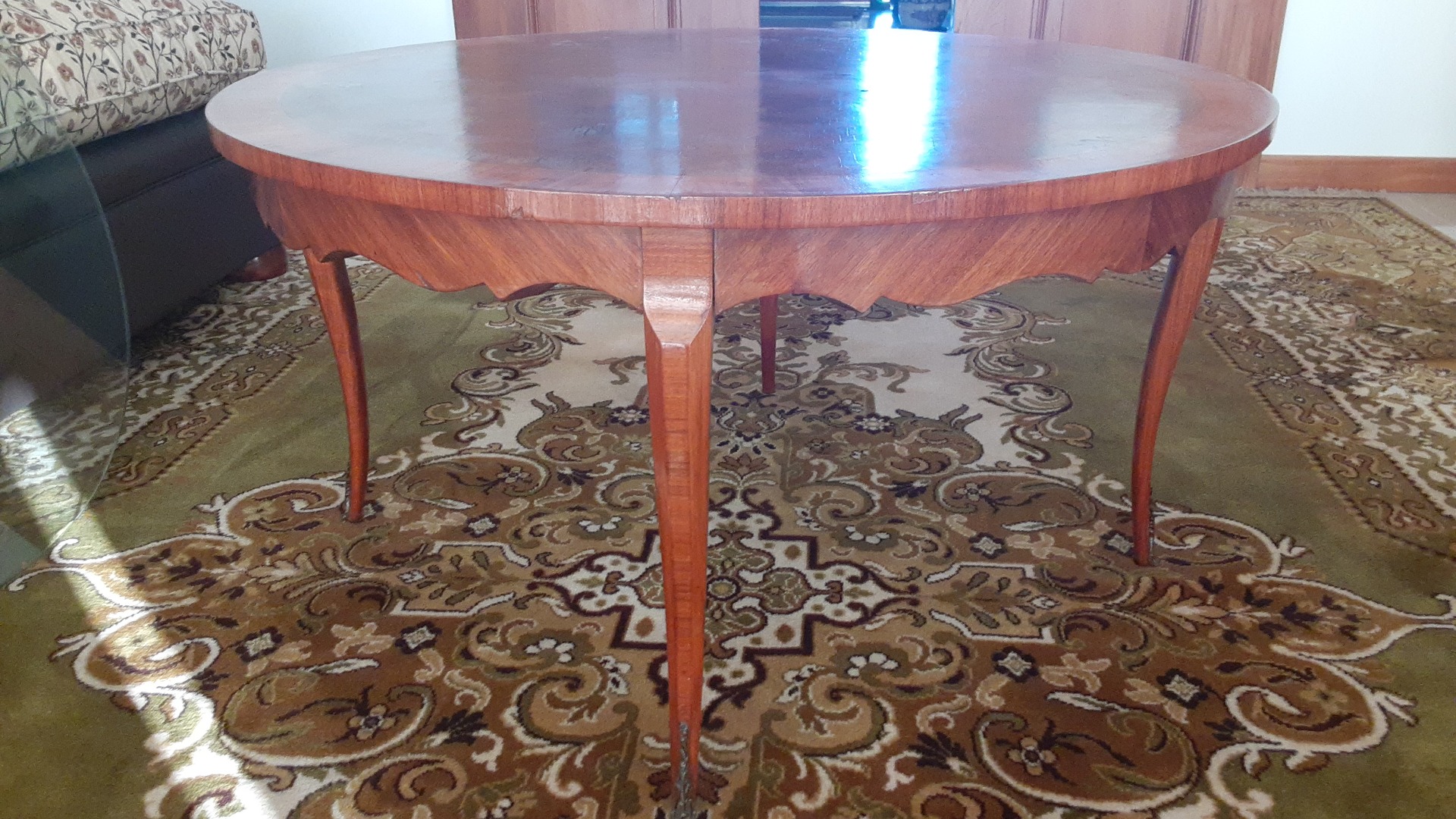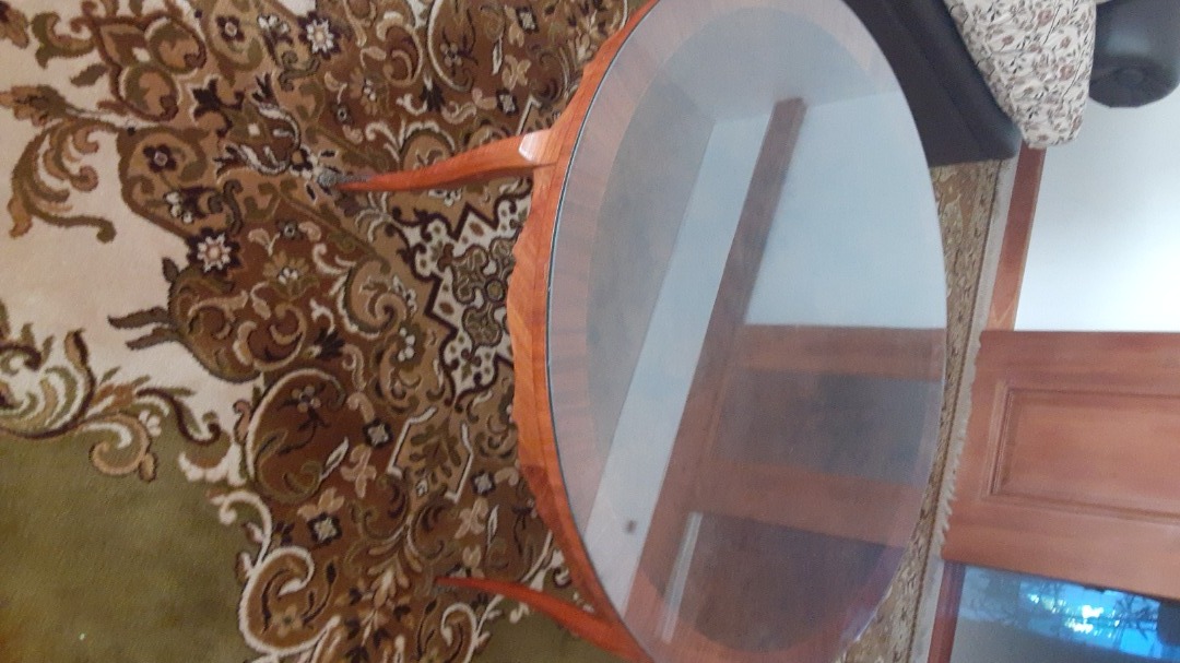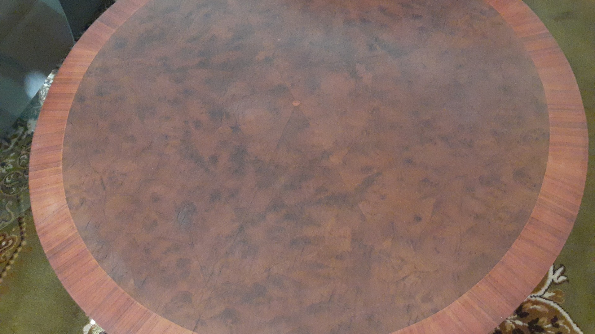mesa ratona de 1 m. de diametro y 54cm de alto enchapado en raiz de nogal y tapa de vidrio de proteccion en muy buen estado