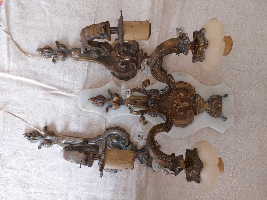 Conjunto de apliques vintage en bronce fundido, dos de una lámpara, uno de dos lámparas